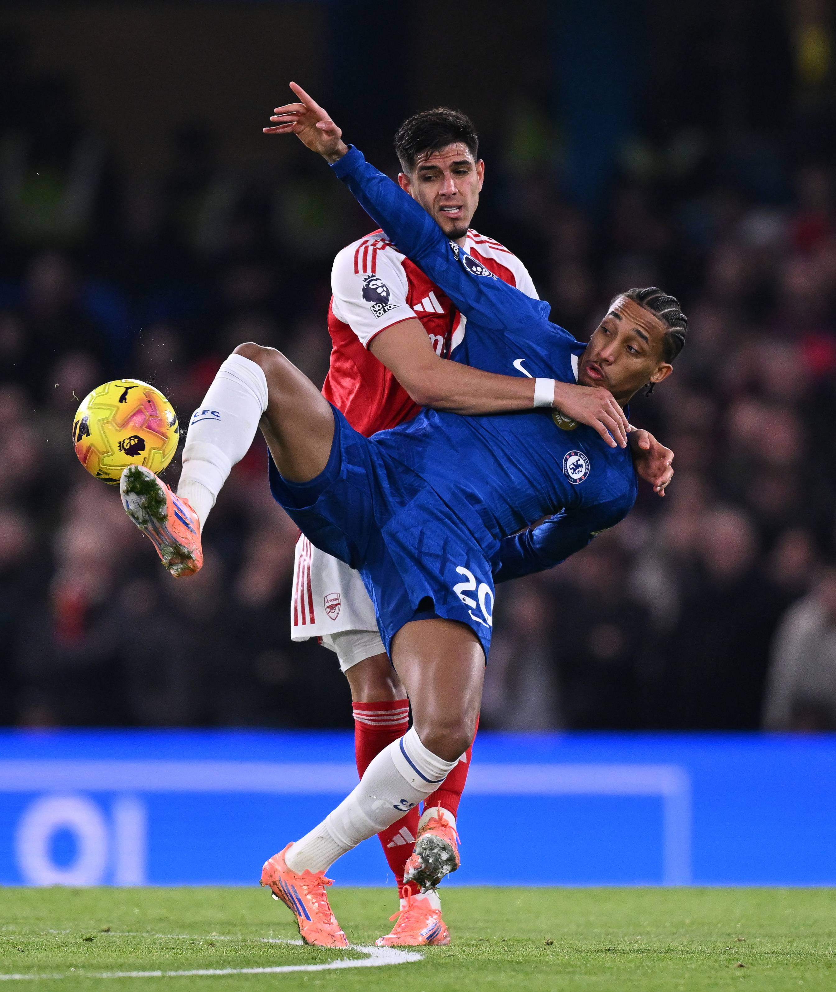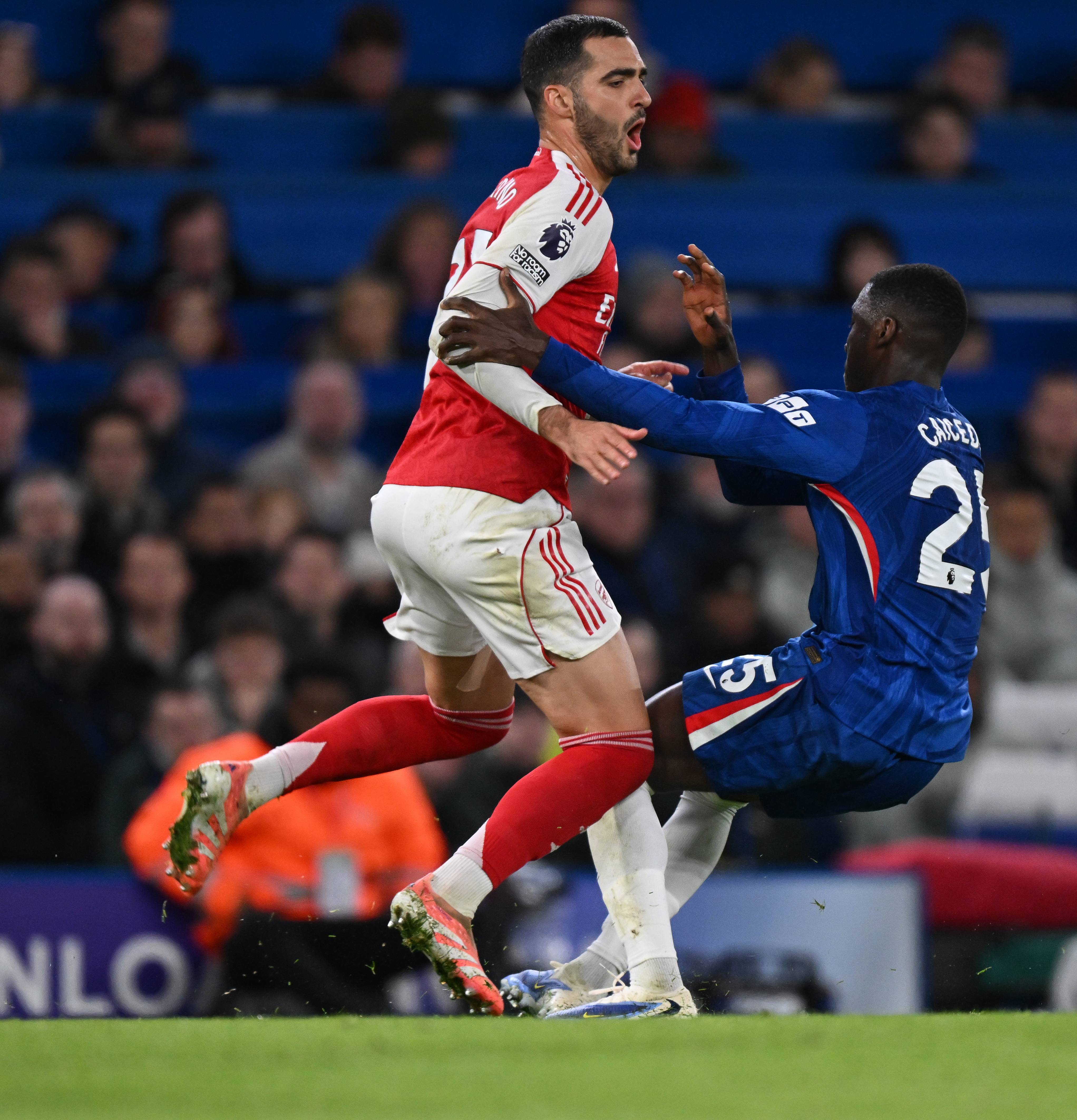 11月30日,切尔西队球员凯塞多(右)与阿森纳队球员梅里诺拼抢。 新华社/欧新