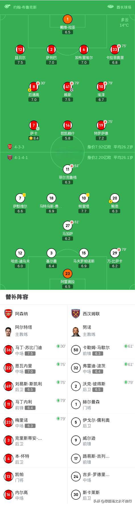 本场面对西汉姆联,阿森纳派出了萨卡、哲凯赖什和特罗萨德的三叉戟,赖斯、艾泽和厄德高则坐镇中场。