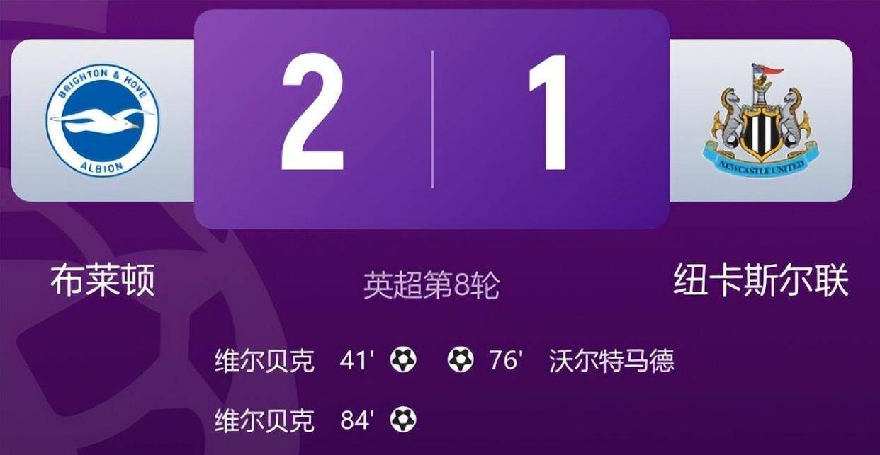本轮最大的冷门发生在运通社区球场。 布莱顿主场迎战纽卡斯尔,谁都没想到会是这个结果。 曼联与阿森纳旧将维尔贝克成了主角,他先是在上半场获得单刀机会冷静破门,帮助布莱顿1比0领先。