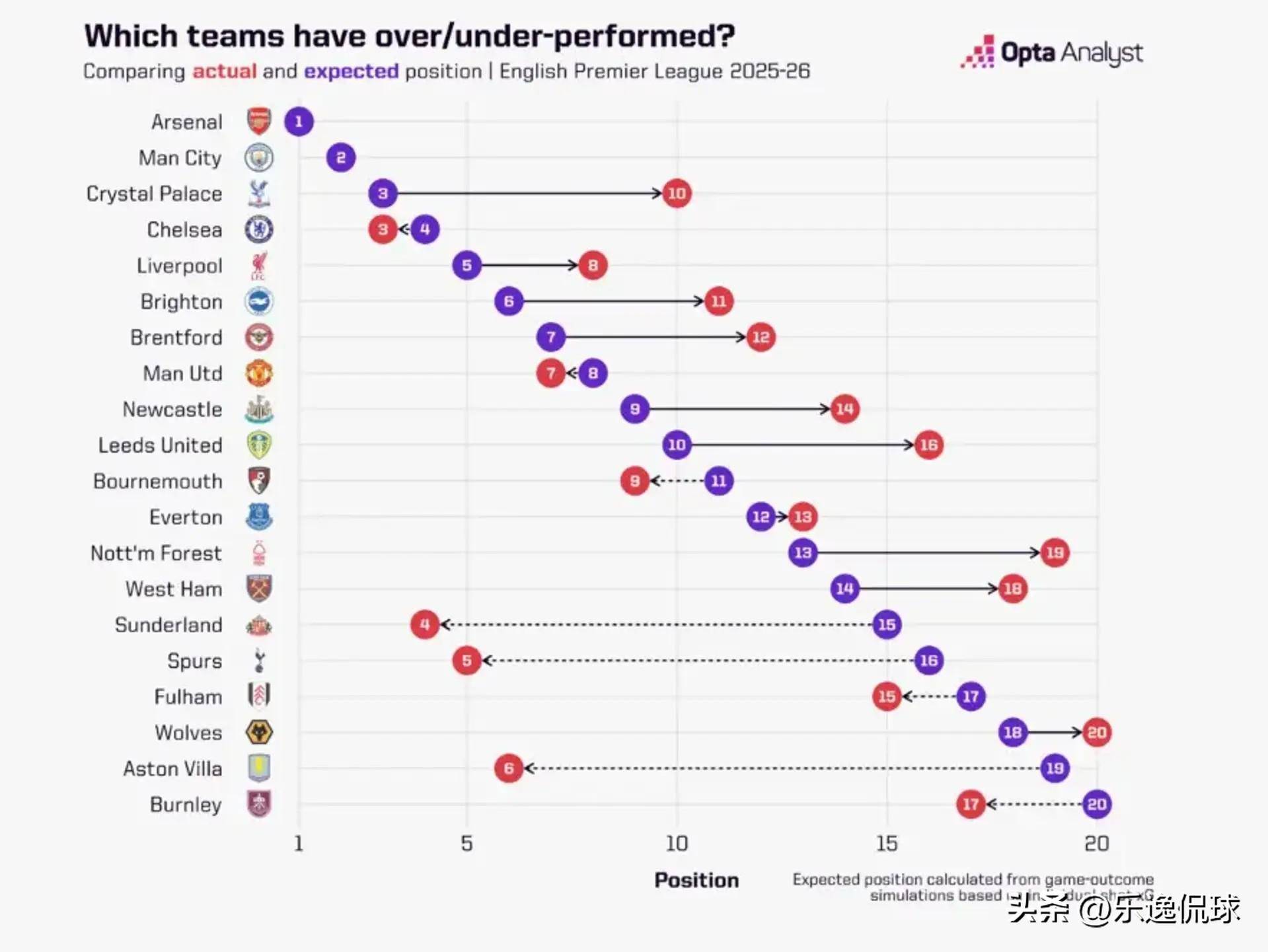 那么,这些数据模型究竟能给我们带来什么呢?让我们通过一张图表来一探究竟。这张图表清晰地展示了2025-26赛季英超联赛各支球队的实际排名与预期排名的对比。图表中,紫色圆点代表预期排名,红色圆点代表实际排名,箭头则将两者连接起来,直观地体现了实际与预期之间的差距。