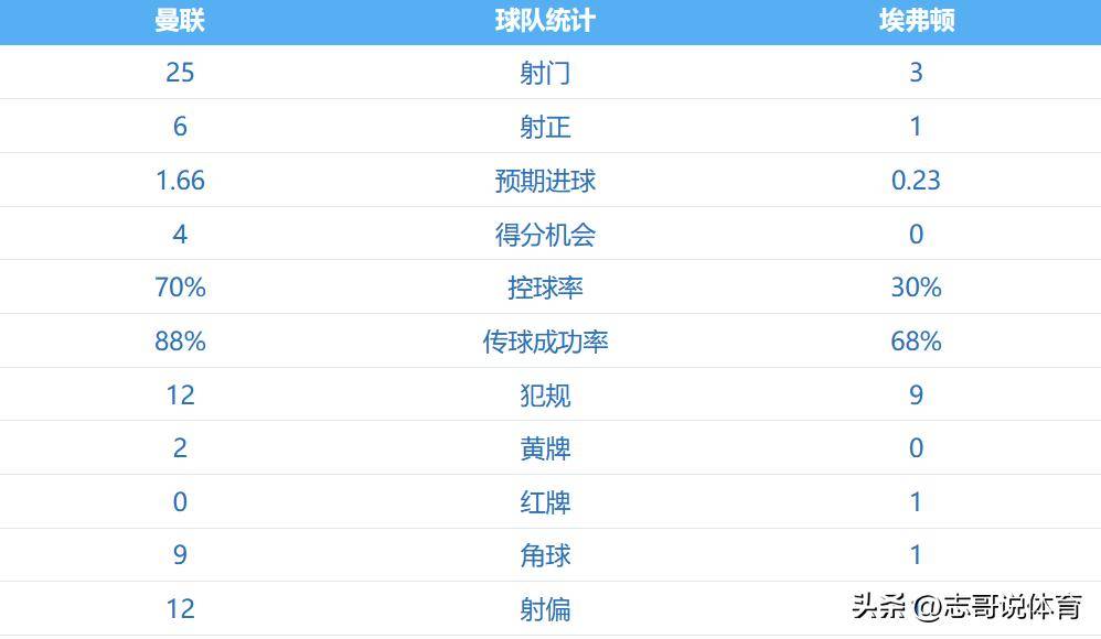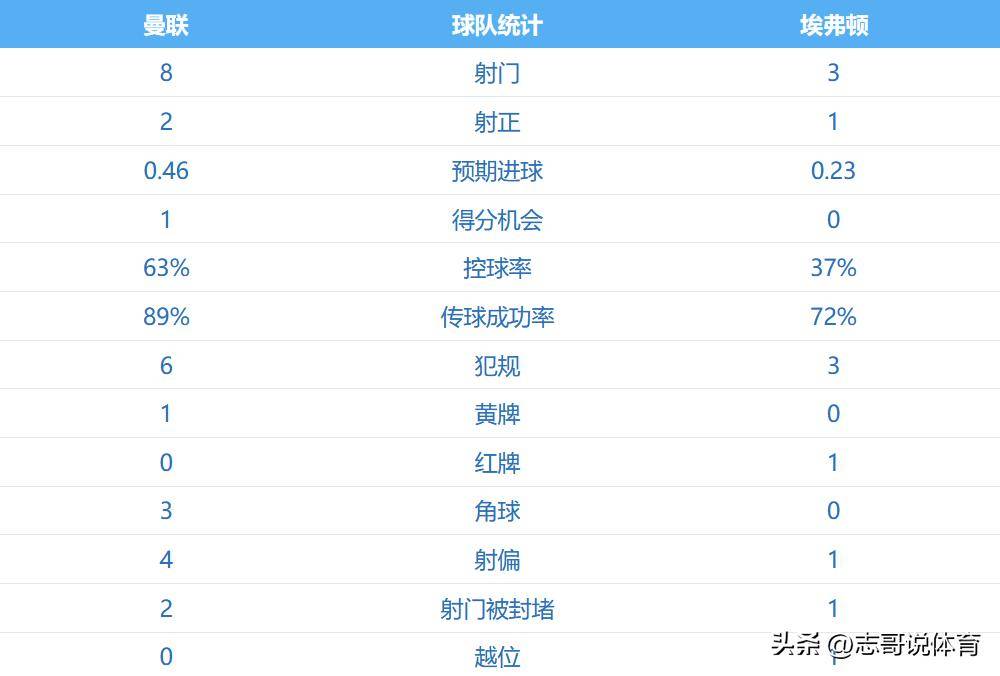 从上半场来看,曼联队还是占据着明显的上风:射门8-3、射正2-1,控球率也是超过了60%、明显强于埃弗顿队,而且他们还早早多打一人、埃弗顿队早早出现伤病,只不过从比分上看,曼联队却0-1落后,有些不太应该。