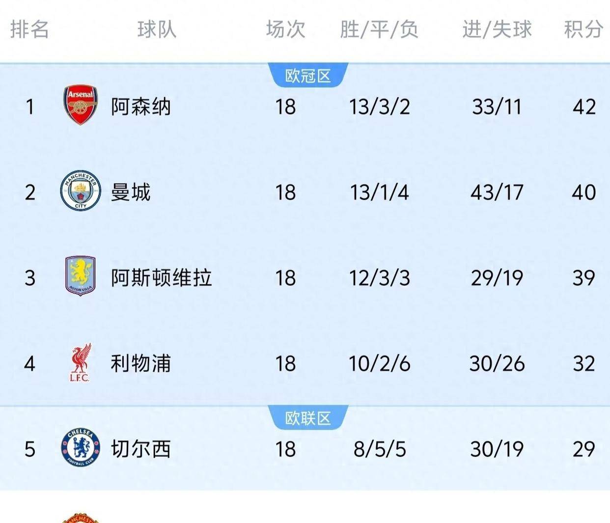 英超直播,英超赛程,英超积分榜,英超比分预测,曼联利物浦直播/覆盖2025年英超联赛所有比赛,提供免费高清中文直播入口、最新赛程安排、实时积分榜、比分预测与波胆分析,聚焦曼联、利物浦、曼城、阿森纳等豪门动态。昨晚的英超第18轮,积分榜前三的球队阿森纳、曼城和维拉,竟然全都踢出了2比1的比分。 领头羊阿森纳在主场2比1险胜布莱顿,曼城客场2比1艰难拿下诺丁汉森林,而最让人瞠目结舌的是阿斯顿维拉,他们在斯坦福桥球场,上半场被切尔西压着打,下半场却连进两球,2比1逆转了蓝军。