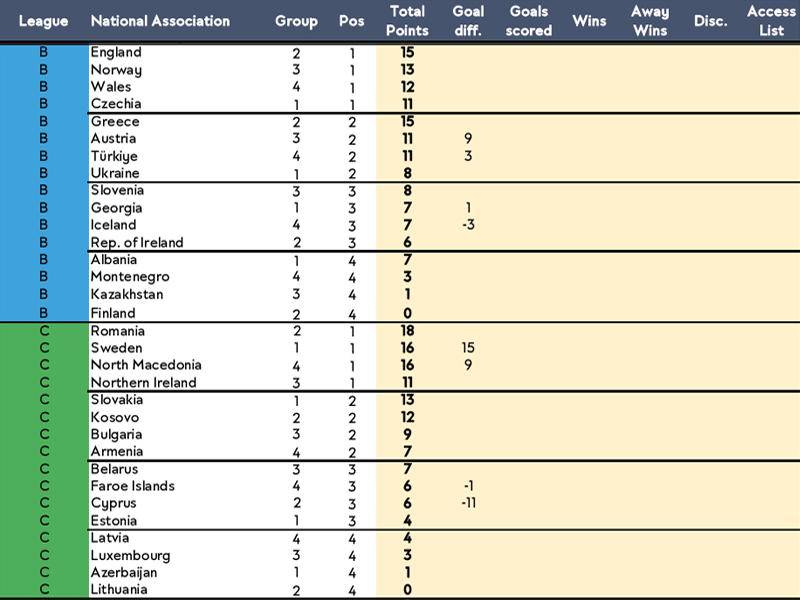 目前,瑞典队仅积1分,几乎可以确定无缘直接晋级世界杯,即使是争取小组第二名的机会,前景也并不乐观。更加不利的是,虽然欧国联中成绩最好的四支球队理论上拥有欧洲区附加赛的资格,但根据欧足联官方的数据,瑞典队仅位列C级别联赛的第二名,排在罗马尼亚之后,甚至在北马其顿之前。而罗马尼亚队在本次欧预赛中的成绩同样不佳,很难挤进小组前两名,这意味着,瑞典队极难通过欧国联的途径获得附加赛的名额。一旦失去欧预赛小组前两名的机会,几乎就等于与世界杯说再见了。