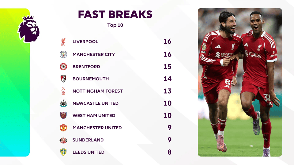本赛季,利物浦与曼城在英超联赛的“快速反击”次数上并驾齐驱,均以16次位居榜首,这充分体现了两队进攻端重新注入的速度和紧迫感。