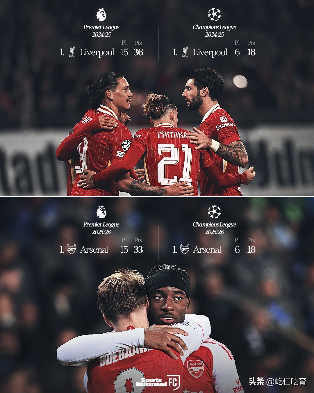 而足球媒体Sports Illustrated FC“不合时宜”的一张对比图,却也在此时发出--似乎,25/26赛季的阿森纳,有点和24/25赛季的利物浦在同期过于相像了!