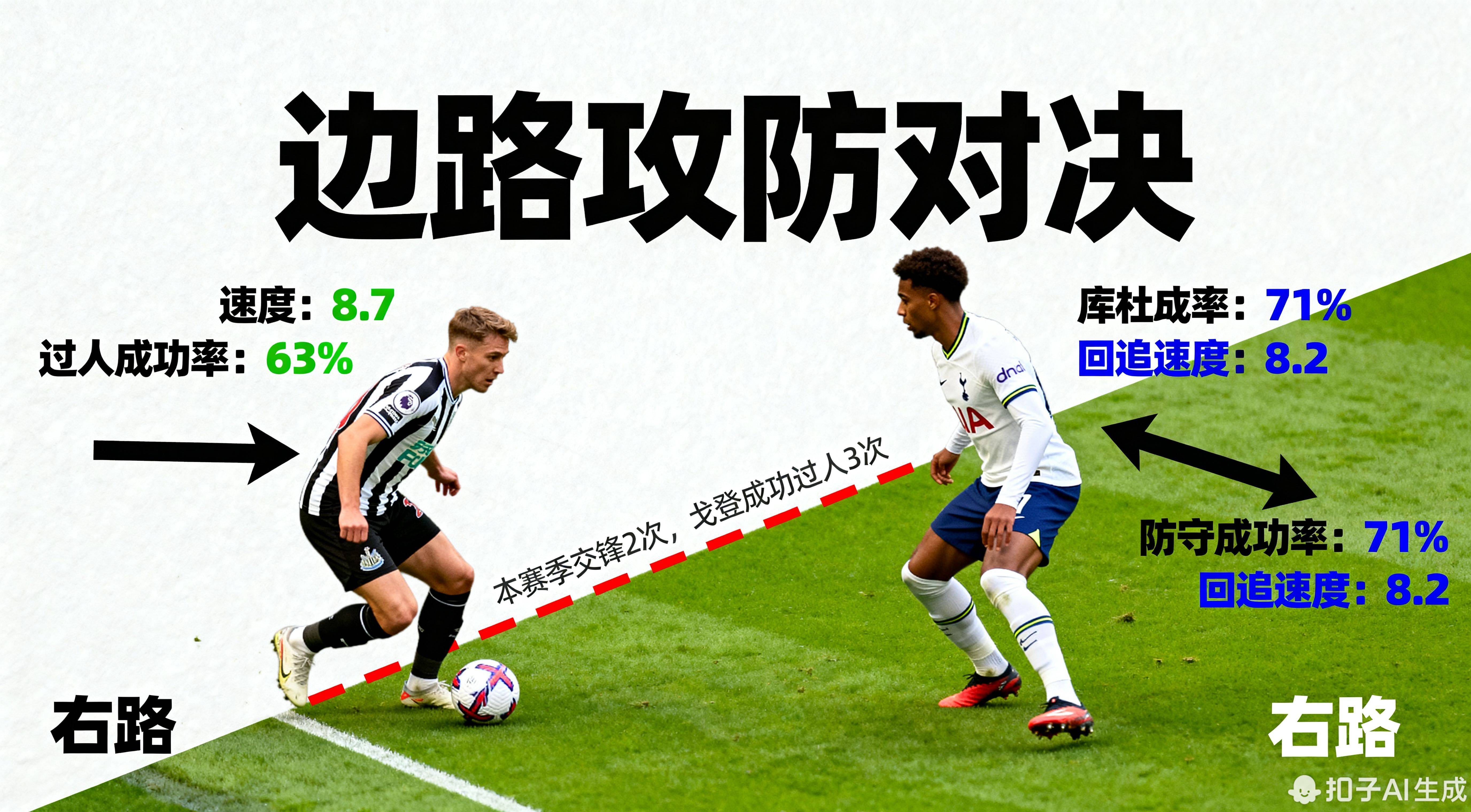 纽卡的橄榄球式开球虽第一落点争顶成功率高(58%),但第二落点控制率仅31%,热刺的贝里瓦尔(场均2.3次二点球争夺成功)可能利用这一弱点发动反击。
