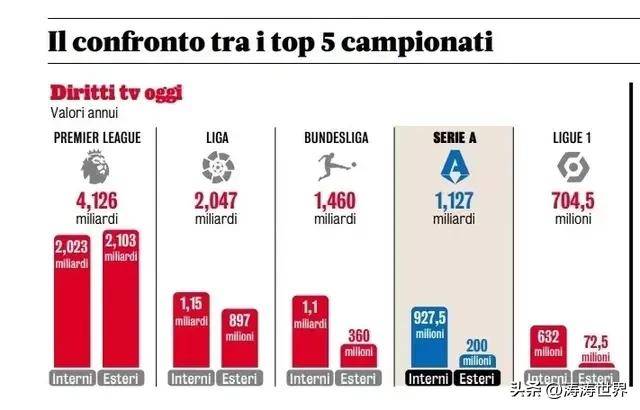 谈到英超的崛起,就不得不提到它在全球足球界的地位。根据2024/2025赛季的转播收入数据显示,英超以41.26亿欧元位居五大联赛收入榜的榜首,远远领先于西甲(20.47亿欧元)、德甲(14.6亿欧元)、意甲(11.2亿欧元)和法甲(7.04亿欧元)。这种“断崖式”的领先,背后是英超强大的市场号召力和商业价值。