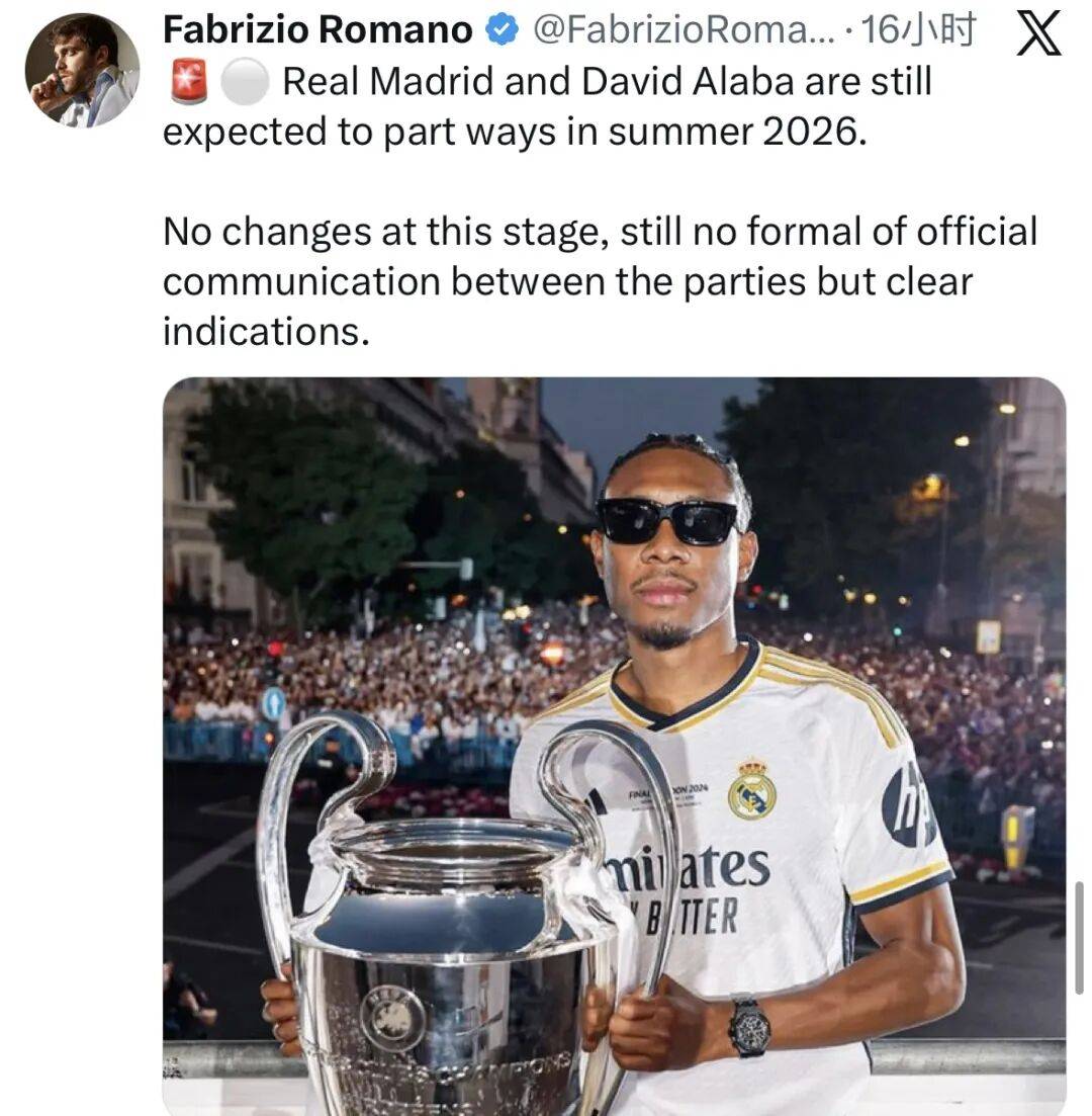 “皇家马德里和阿拉巴预计仍将在2026年夏天分道扬镳。现阶段没有任何变化,双方仍未进行正式或官方的沟通,但已有明确的迹象。”
