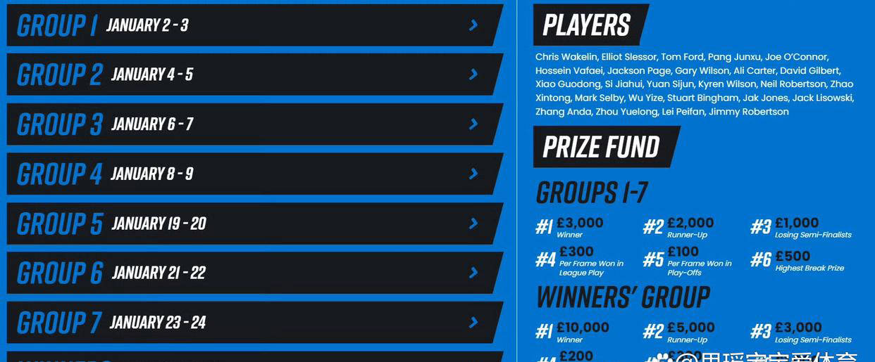 今年的冠军联赛设有七个小组,每个小组的冠军将晋级最终的冠军组,角逐总冠军头衔。比赛采用先小组循环赛再进行小组淘汰赛的赛制,胜者不仅能获得荣誉,更有丰厚的奖金激励。每赢一局比赛,小组赛阶段即可获得100英镑奖励;进入淘汰赛后,每赢一局则奖金提升到300英镑。小组冠军奖金为3000英镑,亚军获2000英镑,季军可拿1000英镑。最终进入冠军组的选手,获胜局奖金更高,每赢一局循环赛奖金200英镑,淘汰赛奖金300英镑。冠军组冠军将额外获得1万英镑,亚军5000英镑,四强均可拿到3000英镑奖金。