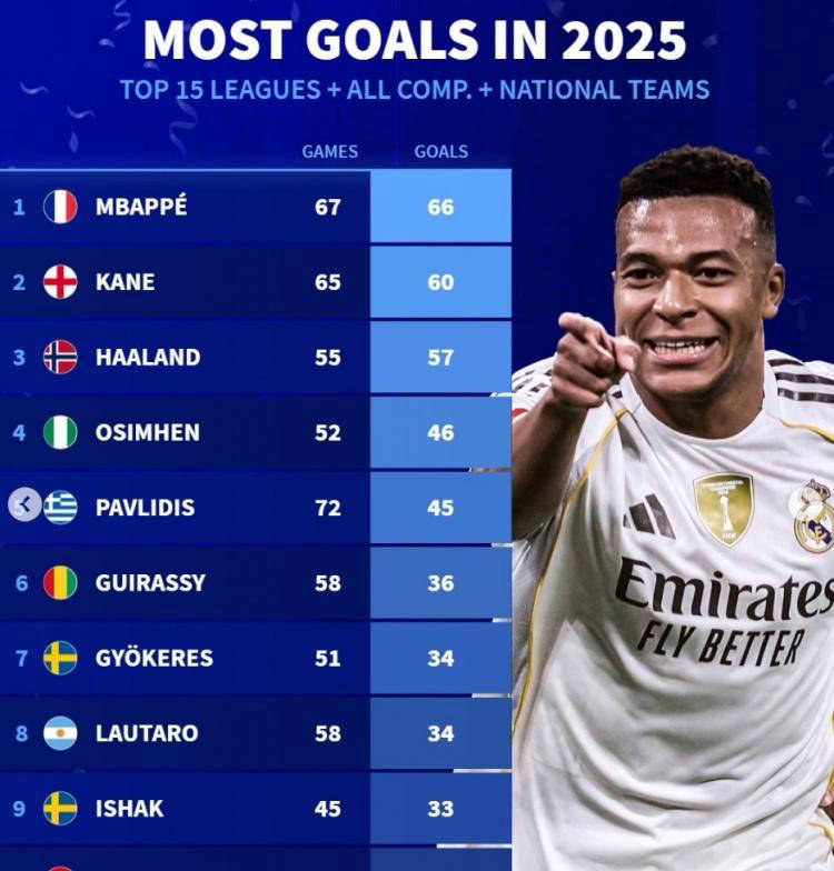 2025年足球进球数据也引人关注,截至目前,皇马前锋姆巴佩以67场比赛打入66球领先所有顶级联赛球员。其次为凯恩60球、哈兰德57球和奥斯梅恩46球,充分显示了这些顶尖前锋非凡的得分效率和稳定性。