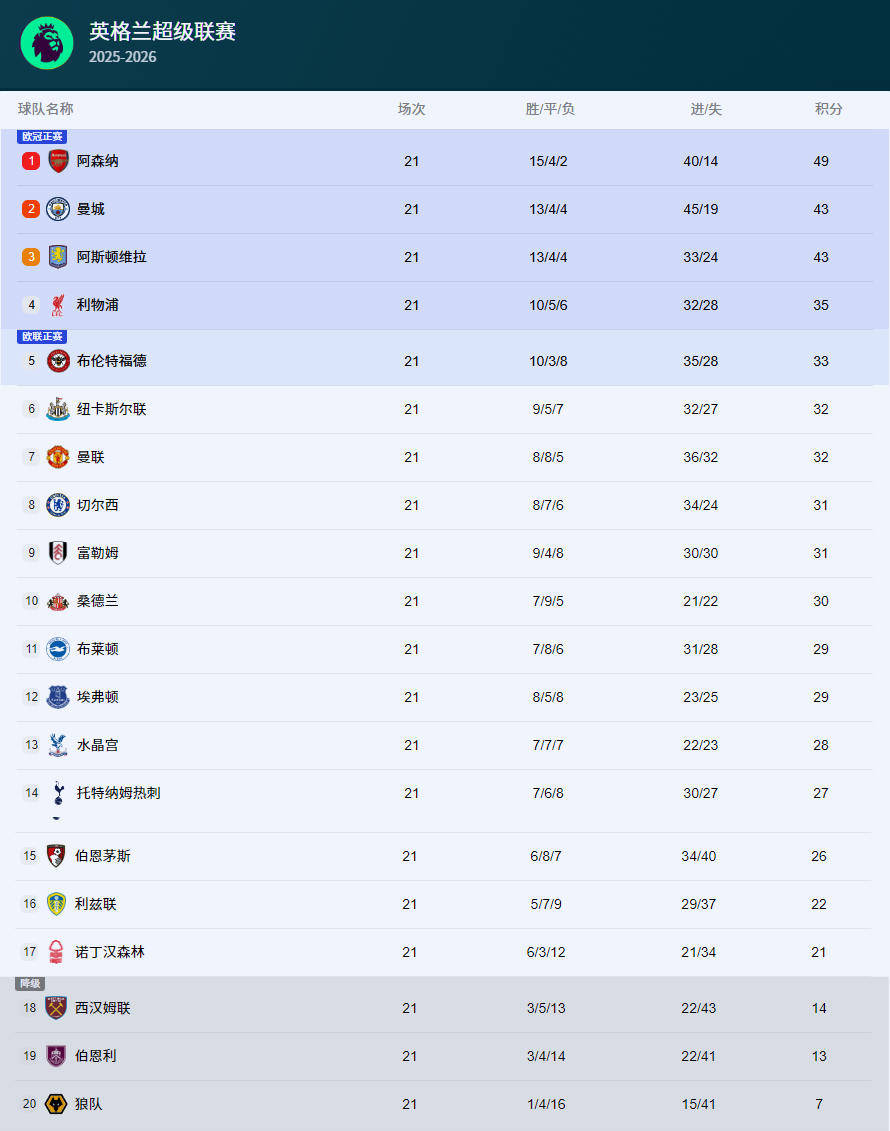 英超直播,英超赛程,英超积分榜,英超比分预测,曼联利物浦直播/覆盖2025年英超联赛所有比赛,提供免费高清中文直播入口、最新赛程安排、实时积分榜、比分预测与波胆分析,聚焦曼联、利物浦、曼城、阿森纳等豪门动态。北京时间1月9日凌晨,英超第21轮焦点战,阿森纳坐镇酋长球场迎战利物浦。上半场,布拉德利吊射击中横梁。下半场,双方机会不多,布拉德利伤退,利物浦全场0射正。最终,阿森纳主场0-0闷平利物浦,联赛三连胜结束,继续6分优势领跑积分榜。