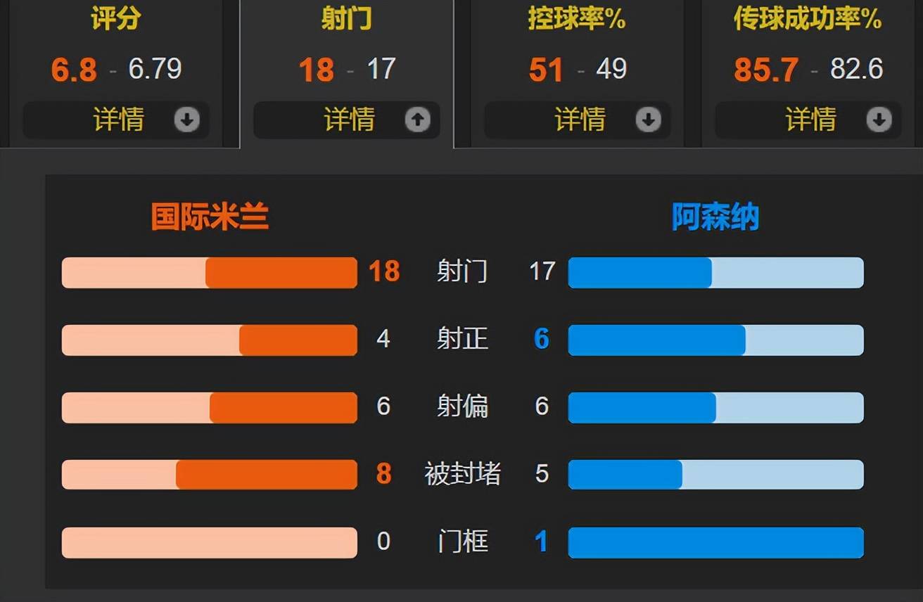 全场比赛,阿森纳的控球率为49%,一共有17次射门,其中6次射正;国际米兰一共有18次射门,其中4次射正。比赛场面很开放,阿森纳更加高效。返回搜狐,查看更多